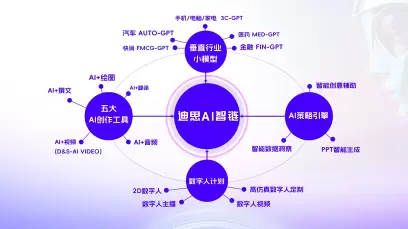 而迪思AI智链平台则依托数据实现创意拓展,通过整合迪思近30年服务汽车、快消、金融、3C等行业的专业经验和高质量数据,该平台集合了图、文、音、视、译、策等多模态AIGC工具、五大垂直行业轻量化小模型、AI策略引擎和数字人等功能。