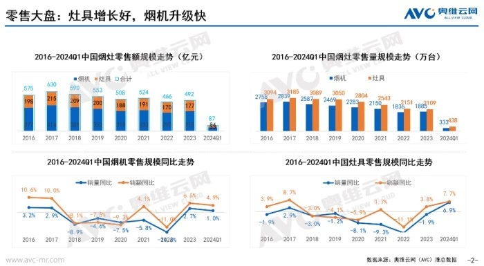 据奥维云网(AVC)数据,2024年一季度,烟机市场零售量为333万台,同比增长1%。其主要以23m³/min、25m³/min及以上大风量及1000pa及以上大风压产品保持高增长。除此之外,消费者的换新升级,还来自“薄而美”的外观设计以及其他方面,比如方太的新月系列、老板电器的双腔系列。