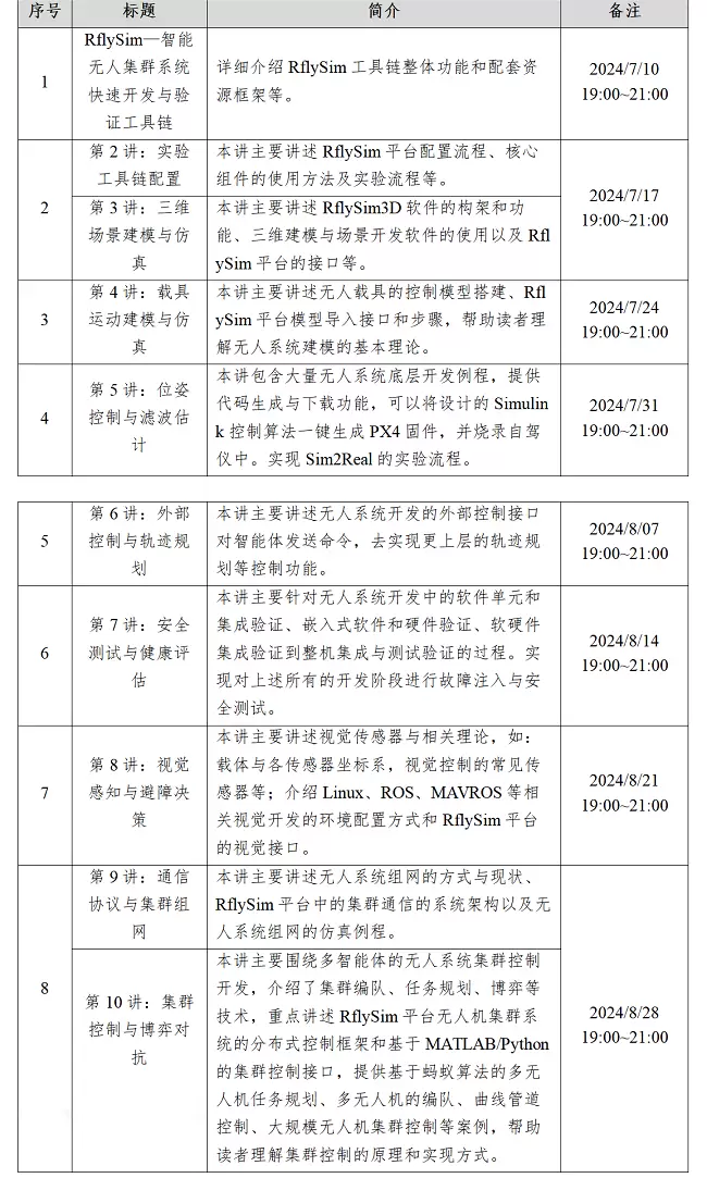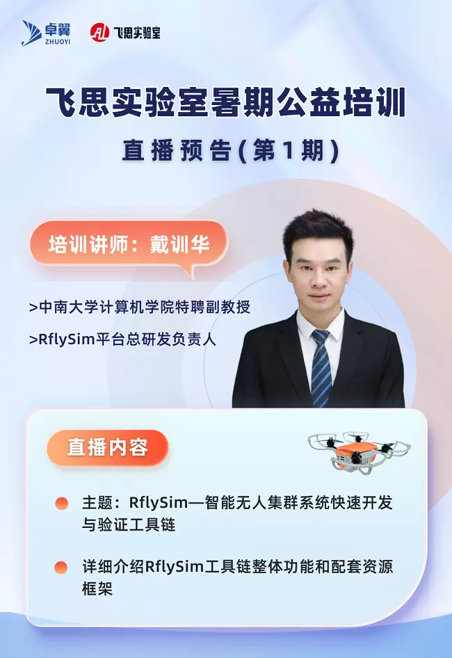 很荣幸地向大家宣布:卓翼飞思实验室将于7月10日正式开启为期两个月的暑期公益培训!本次培训通过【飞思实验室】视频号线上直播,由中南大学计算机学院特聘副教授,RflySim平台总研发负责人戴训华副教授主讲。