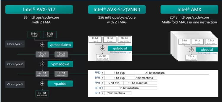 有了英特尔® AMX,处理器每个时钟周期可完成高达2048个INT8运算,比上一代AVX512_VNNI指令提升8倍之多。