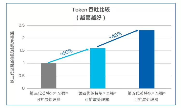 在将处理器升级为第五代至强® 可扩展处理器之后,较上代的吞吐可提升45%左右,首 Token 时延下降50%左右。