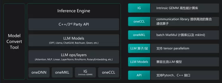 充分利用 AMX/AVX512 等指令集,高效实现核心算子如 Flash Attention 等采用低精度量化,降低数据访存量,发挥 INT8/BF16 运算的优势支持超大规模模型的多机多卡并行推理