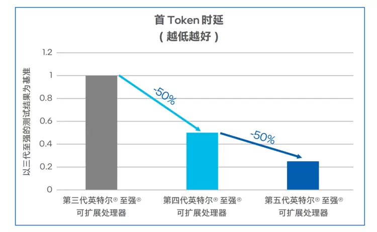 在低延迟的场景,同等并发下,第四代至强® 可扩展处理器的首Token时延比第三代至强® 可降低50%以上。