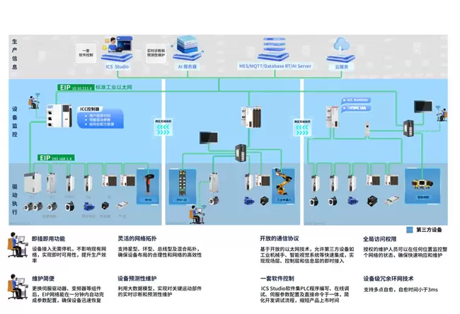 英孚康(i-con)作为国产自动化控制领域的先行者,自主研发的中高端PLC、伺服系统、IO模块等软硬件核心产品,可实现与国际顶尖品牌的无缝替换。选择基于Ethernet/IP的一网到底架构,这并非对EtherCAT的全面否定,而是对工业通信多元需求的深刻理解。Ethernet/IP以其开放性、灵活性和成本效益,为智能制造提供了更为全面的解决方案。在EtherCAT所擅长的领域,Ethernet/IP同样表现出色,并在系统扩展性、设备兼容性和未来技术整合方面展现出更多潜力。