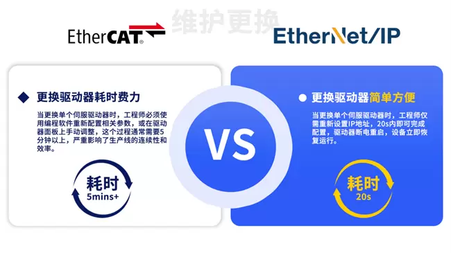 在维护更换方面,EtherCAT协议的局限性更加明显,尤其是在复杂轴应用情况下。当需要更换单个伺服驱动器时,工程师必须使用编程软件重新配置相关参数,或在驱动器面板上手动调整,这个过程通常需要5分钟以上,严重影响了生产线的连续性和效率。