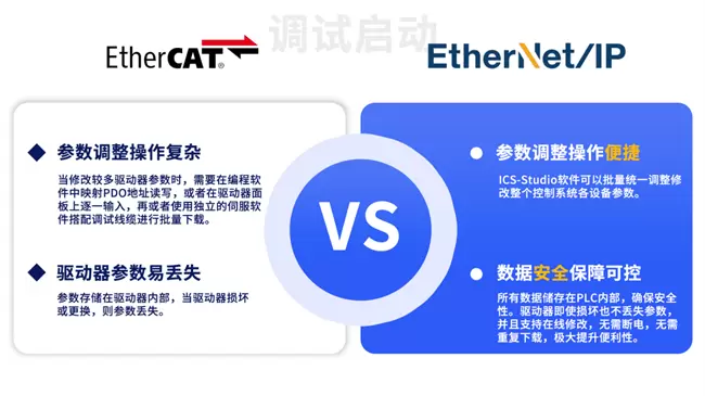 EtherNet/IP 网络通讯协议下,英孚康(i-con)则只需要打开ICS-Studio软件进行参数更改,所有数据储存在PLC内部,确保安全性。英孚康驱动器即使损坏也不丢失参数,并且支持在线修改,无需断电,无需重复下载,极大提升便利性。