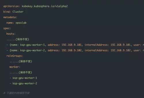 接下来我们使用 KubeKey 将新增加的 GPU 节点加入到已有的 Kubernetes 集群,参考官方说明文档,整个过程比较简单,仅需两步。