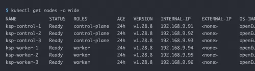 在输出结果中可以看到,当前的 Kubernetes 集群有 8 个节点,并详细展示每个节点的名字、状态、角色、存活时间、Kubernetes 版本号、内部 IP、操作系统类型、内核版本和容器运行时等信息。