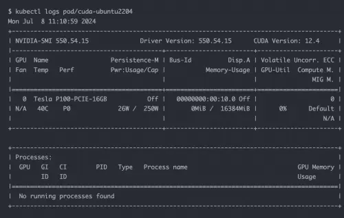 从结果中可以看到 pod 创建在了 ksp-gpu-worker-2 节点(该节点显卡型号 Tesla P100-PCIE-16GB)。