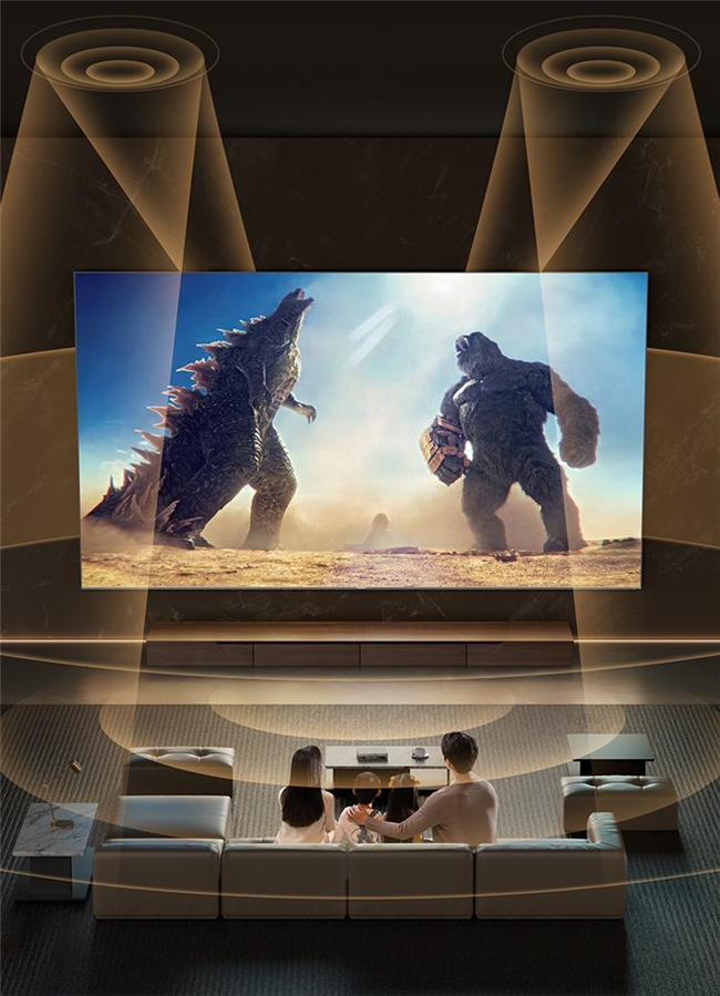 在音质方面,创维100A5D Pro同样不遑多让。它采用了哈曼卡顿x创维声学系统2.1.2天空声场+独立低音炮的音响配置,专门针对大空间进行优化设计。两路天空声道能够构建出立体化声场,带来强烈的环绕感和沉浸感;而独立重低音单元则能够输出震撼的低频效果,让每一次声音都直击心灵。这种音效配置不仅适合观看电影、电视剧等影视作品,更能够满足家庭K歌、听音乐等多元化娱乐需求,堪称“百吋电视音响最优解决方案”。