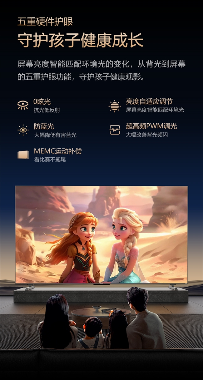 此外,创维100A5D Pro的屏幕亮度可以智能匹配环境光的变化,从背光到屏幕拥有“0眩光、亮度自适应调节、防蓝光、超高频PMW调光、MEMC运动补偿”等五重护眼功能,守护孩子眼健康。时下正值暑期,无论是上网课还是观影、看动画,创维100A5D Pro对于孩子们来说都更友好。
