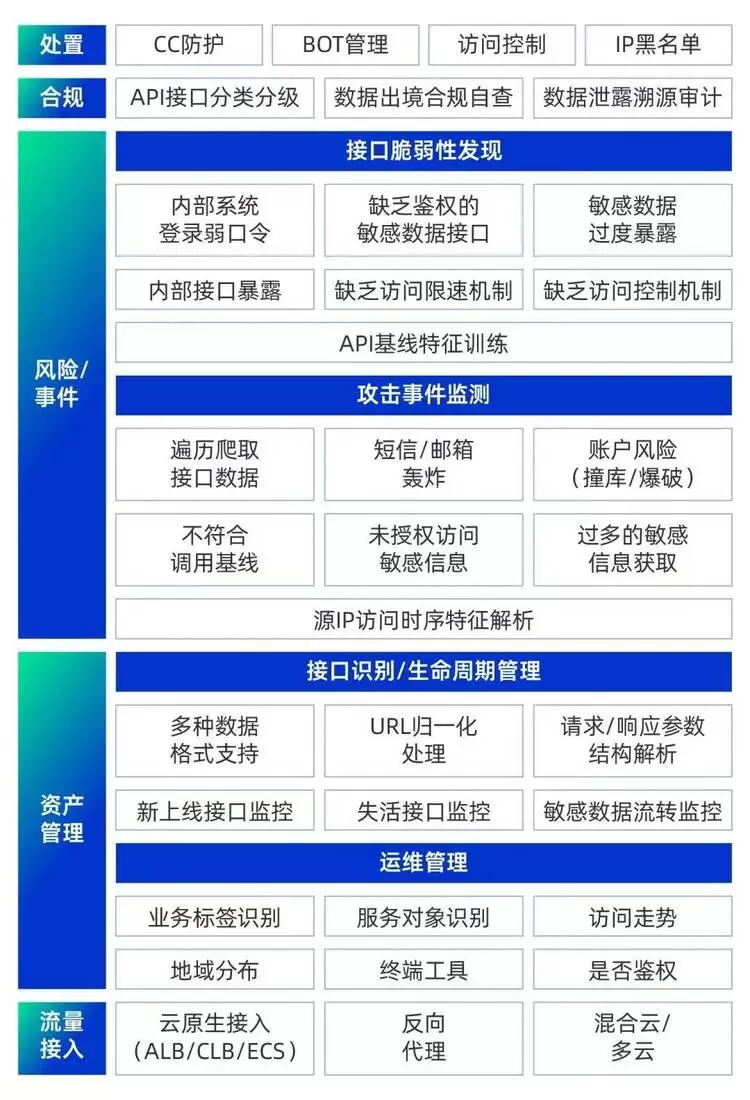 在API安全检测上,阿里云WAF发布了全新2.0版本,对产品架构进行了全面升级改造,在检测时效性、丰富度、准确率以及使用体验等方面均有大幅提升,提供近乎实时的检测能力,包括自动化API接口资产识别、API敏感数据分析等,并可通过多维度构建API基线画像,实现API分类分级管理。此外,阿里云WAF也增强了接口脆弱性发现能力,支持6大类共38种接口风险检测能力。同时强化了攻击检测能力,支持5大类,共25种异常行为检测,检测能力极大增强。