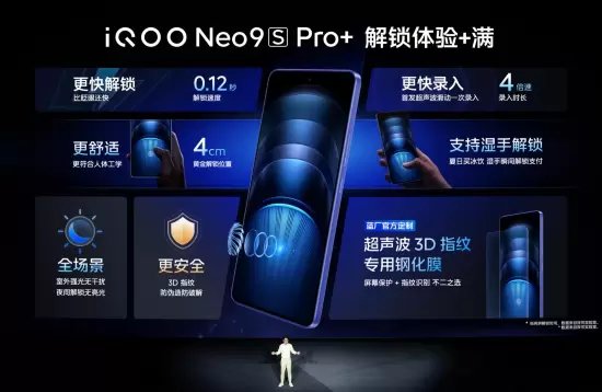 此次,iQOO Neo9S Pro+还行业首发超声波滑动一次录入,对比普通光学指纹的按压录入简直像开了四倍速,同时推出为超声波3D指纹量身打造的钢化膜,将解锁体验拉满。