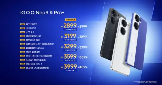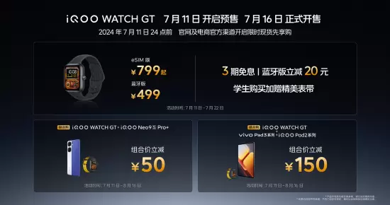 iQOO Neo9S Pro+共有Buff蓝、星曜白和格斗黑三种配色,提供12GB+256GB、12GB+512GB、16GB+256GB、16GB+512GB和16GB+1TB存储组合可选,到手价2899元起;iQOO WATCH GT eSIM版售价799元起,蓝牙版499元,7月11日—7月22日下单蓝牙版立减20元,到手价仅需479元; iQOO Pad2 Pro到手价 3299元起;iQOO TWS 1i售价 99元,与iQOO Neo9S Pro+组合购买可享至高40元优惠,到手仅需59元。