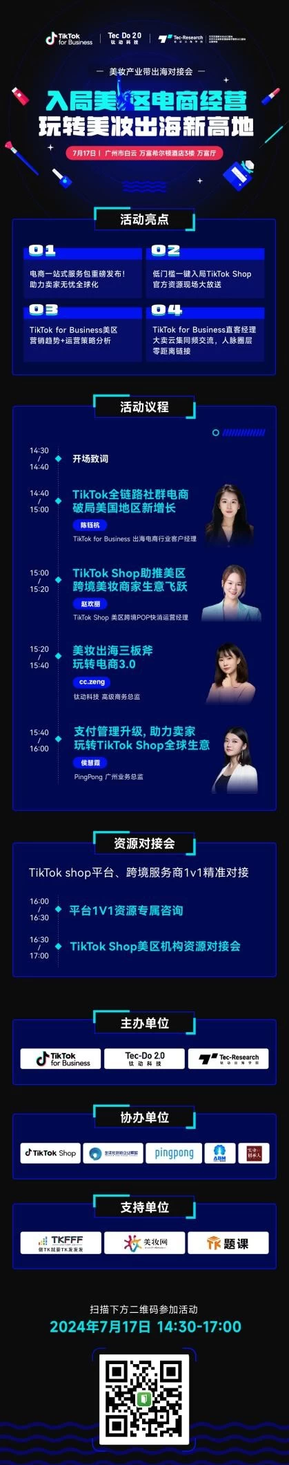 为助力美妆品牌把握市场脉搏,7月17日,钛动科技联动 TikTok for Business 和钛动出海学院,举办美妆产业带出海对接会——“入局美区电商经营,玩转美妆出海新高地”。会议将邀请到 TikTok for Business 出海行业经理陈钰杭、TikTok Shop 美区跨境POP快消运营经理、钛动科技 高级商务总监cc.zeng、Pingpong 广州业务总监侯慧霞等行业大咖交流分享,深入解读美妆出海的差异化适应策略。