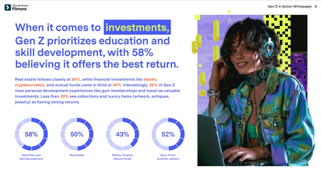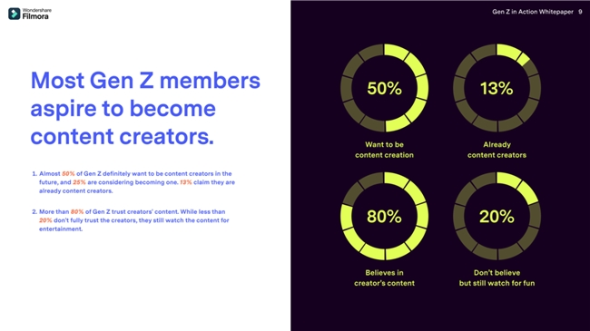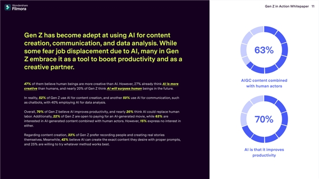 近日,AIGC软件A股上市公司万兴科技(300624.SZ)旗下视频创意软件WondershareFilmora面向全球创作者发布《Z世代白皮书》(下称《白皮书》),基于对近千名北美Z世代人群的深入访谈,从内容创作、意见领袖(KOL)文化、人工智能等角度进行分析,揭示了这一代人对内容创作的热情与追求,并为理解Z世代在推动社会和行业发展中的潜力和作用提供了深刻的见解。