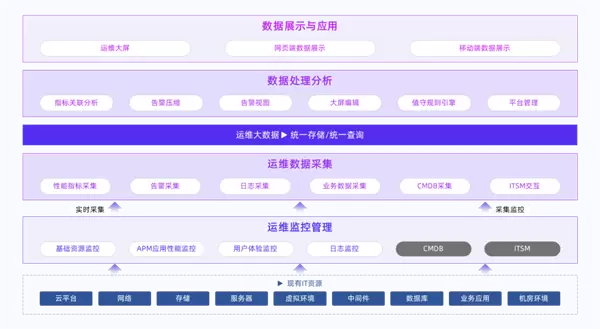 实现客户全量运维数据资产沉淀,以统一数据融合平台的形式,将当前多数据通道、多数据类型、多数据格式、多数据标准并存的运维数据,以业务视角设计运维管理故事线,并形成统一运维大屏作为日常运维管理的数据检阅工具。