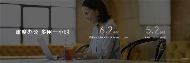 荣耀MagicBook Art 14最高搭载英特尔® 酷睿™Ultra 7 155H处理器,在平台级AI使能的OS Turbo 3.0技术加持下,以智慧感知使用场景,实现对底层资源的全面精细化调度,使其在性能释放与持久续航中找到了最优解。在长时间运行多个大型文档、办公软件或者视频会议等高负载重度办公场景下,荣耀MagicBook Art 14依然达到6.2小时的超长续航,比友商多用1小时,全面保障用户日常使用的流畅性与持久性。与此同时,日常场景下的功耗最高下降28.5%,响应速度最高提升30%,带来行业领先的续航和性能体验。