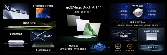 基于AI PC上的领先技术,荣耀把AI技术与用户体验全面融合,用AI使能智能硬件、人机交互和多端生态,构建更懂用户的AI PC体验。今年三月,荣耀首款AI PC荣耀MagicBook Pro 16以兼具轻薄、高性能、长续航的优势,以及“静音性能”模式的亮眼功能,赢得不少赞誉,开启了AI PC全新时代。作为超轻薄领域的首款AI PC产品,荣耀MagicBook Art 14在AI能力和体验上进一步升级,带来更符合用户实际使用需求的场景化人机交互体验,引领AI PC行业新的潮流。