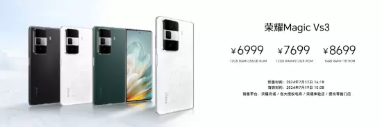 荣耀Magic V3和荣耀Magic Vs3将于2024年7月12日16:18开启预售,7月19日10:08在荣耀商城、各大授权电商、荣耀体验店、授权零售门店正式开售。其中荣耀Magic V3提供12GB+256GB、16GB+512GB、16GB+1TB三个容量版本,售价8999元起;荣耀Magic Vs3提供12GB+256GB、12GB+512GB、16GB+1TB三个容量版本售价6999元起。