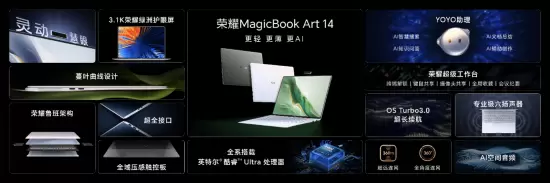 作为荣耀旗下首款超轻薄AI PC,荣耀MagicBook Art 14的AI能力和体验全面升级,在平台级AI使能的OS Turbo 3.0技术加持下,打造出行业领先的续航和性能体验。荣耀MagicBook Art 14最高搭载英特尔酷睿Ultra 7 155H处理器,拥有日出印象和夏日橄榄两款配色,售价7999元起,将于2024年7月12日16:18全渠道开启预售,2024年7月26日10:00正式首销。