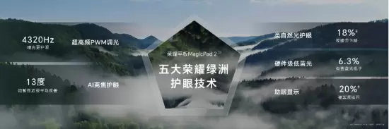 荣耀平板MagicPad2以AI使能屏幕护眼,在家族优秀护眼基因的基础上再进一步,首发搭载AI离焦护眼技术,用AI护眼能力守护孩子用眼健康。荣耀平板MagicPad2还采用平板行业唯一4320Hz零风险调光,拥有类自然光护眼、硬件级低蓝光、助眠显示等业界领先科技,通过了包括德国莱茵TÜV无频闪认证零风险调光、德国莱茵TÜV低蓝光认证过滤有害蓝光、国家眼科工程中心护眼认证、VicoA+视觉舒适度测试在内的四重权威护眼认证,为用户提供更加极致的多重护眼保障。
