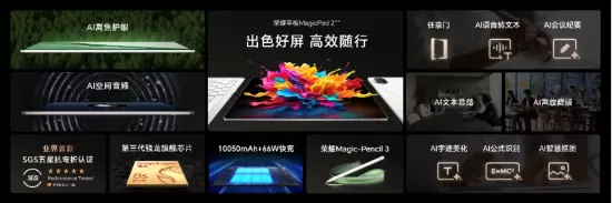 荣耀终端有限公司CEO赵明表示:“荣耀平板MagicPad2以AI使能硬件,屏幕护眼&空间音频以及芯片体验。以AI使能软件,带来学习办公新体验,成为荣耀平板的巅峰之作。”