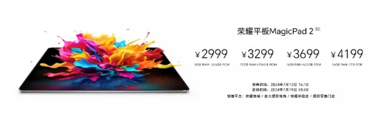 荣耀平板MagicPad2于7月12日16:18分开启预售,7月19日10:08分全渠道正式开售,欢迎大家到荣耀商城/各大授权电商/荣耀体验店及各授权零售门店进行选购。