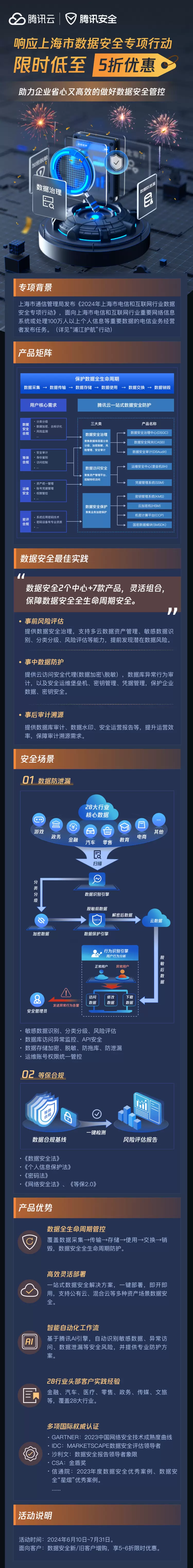 即日起至7月31日,应用部署腾讯数据安全一体化管控方案,享最低5折优惠,省心又高效实现数据安全管控: