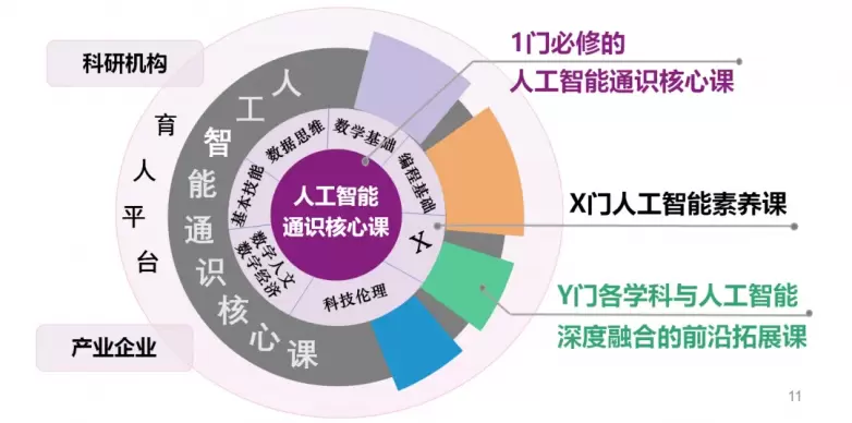 “人工智能通识核心课程体系”分为“1+X+Y”三个层次,以 1 门必修的人工智能通识核心课、X 门人工智能素养课、Y 门各学科与人工智能深度融合的前沿拓展课为基础,从知识、能力、价值观与伦理三个维度开展教育教学,同时探索人工智能与教育深度融合的实践路径,在教学内容、师资团队、教学方式、学习方式、考核方式等方面推动变革。