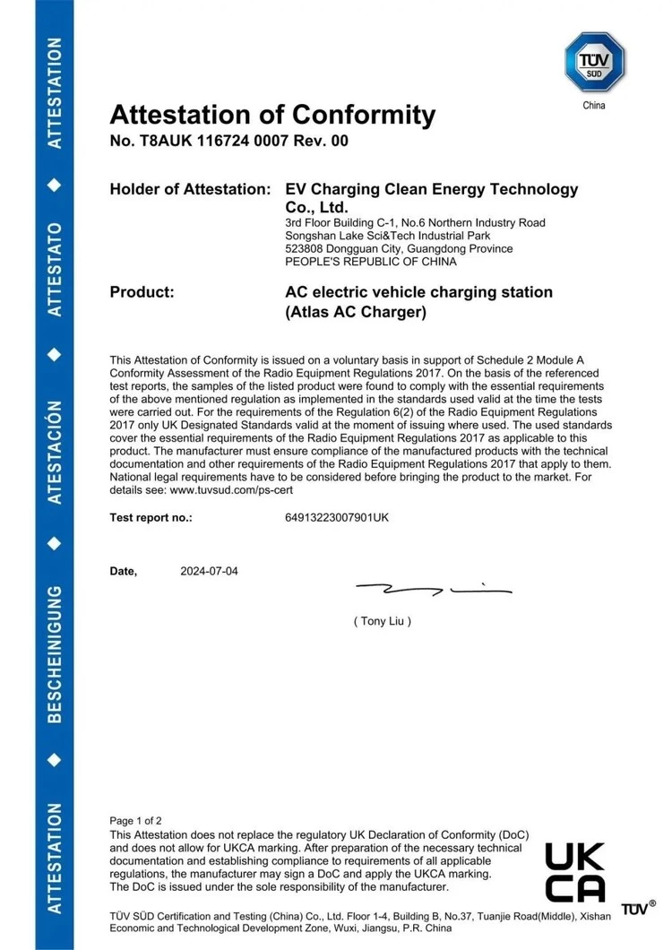 在此次项目认证中,TÜV南德按照UKCA技术规范标准,对易事特中能易电Atlas系列7kW/11kW户用版和7kW/11kW/22kW运营版交流桩产品进行了严格完整的测试。相关产品均顺利通过各项检测,并最终获得UKCA证书。这标志着易事特中能易电充电设备满足英国市场的准入标准,获得了竞争国际市场的通行证。