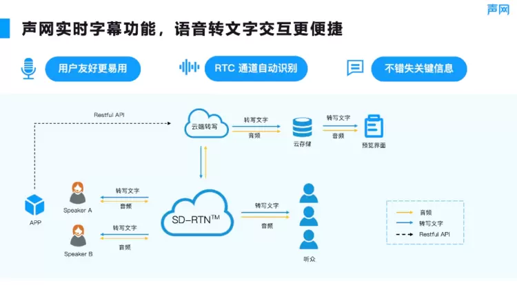 声网的实时字幕功能基于弱网对抗和拥塞控制算法,具有较强的抗弱网能力,能保障文字与语音的高效同步。同时,声网的实时字幕功能灵活支持市面上主流的 STT 方案,做到无感切换,且设备端无需开发工作,通过调用声网云端 API 即可实现该项功能。