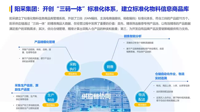 阳采开创“三码一体”标准化体系。阳采建立了标准化物料信息商品库管理系统,开创了三码(EAN编码、主流电商链接码、税收编码)标准化体系,符合三码的产品超70万个。阳采供应链通过“三码一体”的精准商品大数据,在经营过程中发挥了重要的价值:首先,精准筛选推荐专用产品池,以有效精准的产品数据满足客户的采购需求;其次,优化仓储管理,精准计算出采购入仓产品的种类和数量;第三,为开发自有品牌产品及营销策略提供有力支持。