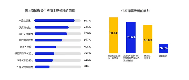 政企网上商城多维度关注优供优服优配。在供应商选择方面,网上商城重点关注供应商的“优供优服优配”,采购用户更倾向选择长期稳定的供应商,保障持续的供货,因此要求供货稳定性、履约交付能力、物流配送时效性、售后服务能力等。