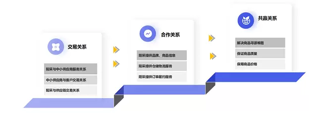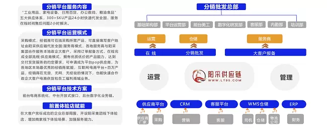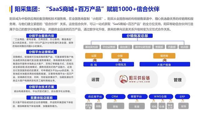 阳采集团成为中型供应商的集货商和技术服务商,在全国各地复制“小阳采”。以百万商品供应链为基础,借助先进的科技研发能力,构建一套完整的商城B2B2B电商采购管理SaaS系统,“商城+百万供应链”商业模式。阳采集团从全国各地的传统销售渠道中,精心挑选了最优秀的经销商和服务商,与他们建立了紧密的“信合伙伴”关系,这些信合伙伴通过阳采集团的赋能,可以一站式获取“商城+百万产品”的全方位支持。这种赋能模式旨在帮助信合伙伴打造属于自己的数字化电商平台,提供全品类的百万产品。数字化升级推动了阳采与经销商关系的转变:由原来的单向买卖升级转变成双方交互式合作。
