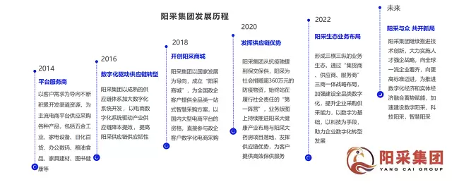 阳采集团从专用物资扩至通用物资,十年成长跻身百亿梯队。阳采集团受惠于国家的阳光采购政策,十年成长跻身百亿梯队。从专用物质供应扩展到通用物质供应,从场景化解决方案提供、从场景化服务方案提供通用物质的全品类供应。以阳采供应链-集货商、阳采商城-供应商、阳采科技-服务商、阳采仓储式卖场--零售商“四商一体”为战略布局。目前有员工1500+,47个子公司。