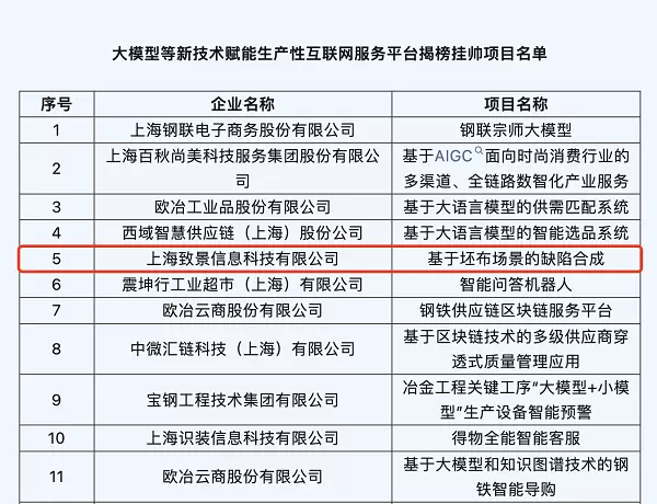 为贯彻《推动区块链、大模型技术赋能生产性互联网服务平台发展实施方案》《上海市促进产业互联网平台高质量发展行动方案(2023-2025年)》,打造新质生产力,根据《上海市经济信息化委 市商务委关于开展大模型等技术赋能生产性互联网服务平台揭榜挂帅项目征集的通知》要求,经推荐、企业申报、材料初审、专家评审等多个环节,入围项目名单近日公布,致景科技的“基于坯布场景的缺陷合成”项目成功入选。