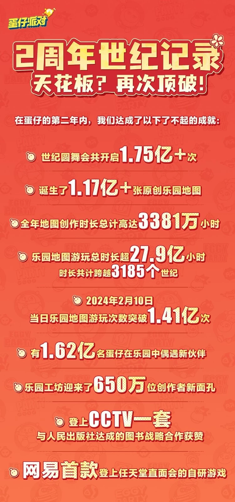 创作者价值得到认可和肯定的同时,也带动《蛋仔派对》持续领跑UGC赛道,多项关键性数据迎来增长。《蛋仔派对》制作人Kwan致辞时表示,大家共同的造就了日新月异的「蛋仔乐园」,截至目前,原创乐园地图数超过了1亿张,全年地图创作时长超3000万小时。而玩家体验方面,乐园地图游玩总时长近28亿小时,今年春节单日游玩次数更是创下1亿次的新高。