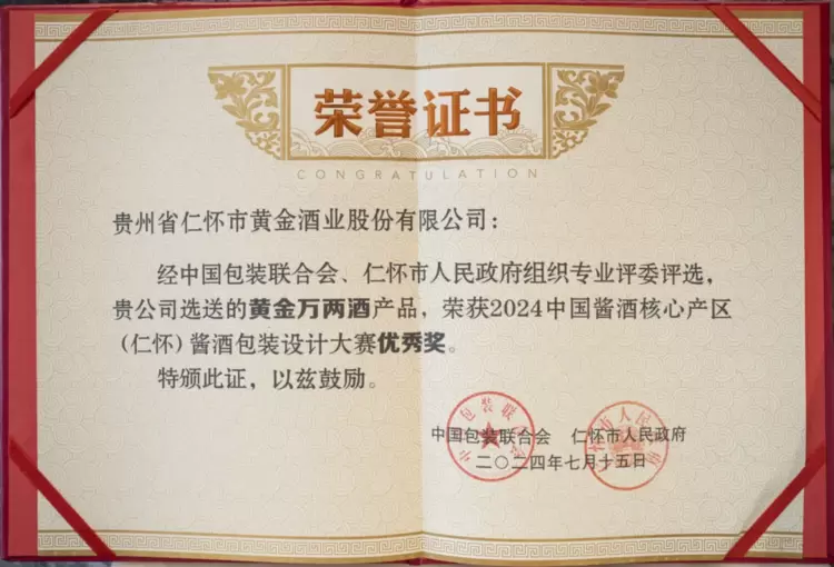 在此次中国酱酒核心产区(仁怀)酱酒包装评审暨创意设计大赛中获奖,这一殊荣不仅是对黄金万两创意设计的肯定,更是对黄金酱酒家族品牌价值的认可。未来,黄金酱酒将继续秉持创新和品质并重的原则,持续为广大消费者带来更多美好的体验,并在市场上创造更多的辉煌成绩,续写品牌传奇。