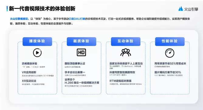 其次,对于出海模式传统单一,如何推进业务敏捷创新的问题,火山引擎视频云可助力企业带来新增长点。火山引擎新一代音视频技术,以“体验”为核心,帮助企业轻松构建音视频服务,实现用户播放体验、画质体验、互动体验、性能体验的提升,提高用户粘性,轻松打造下一个“爆款”应用。如某游戏出海企业推出的一款手游产品风靡东南亚市场,借助了火山引擎音视频技术,大幅优化了语音性能,保障全球玩家体验一致。