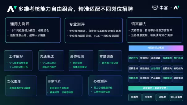 此外,牛客AI面试还支持多维度考核,涵盖专业能力、通用能力、语言能力、心理评估和工作偏好等,为企业提供适配不同岗位的全方位的招聘决策支持并生成智能生成可视化人才报告。