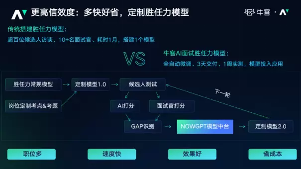 传统胜任力模型构建耗时久、效率低、不准确。牛客AI面试凭借全自动微调技术,实现3天交付、1周实测的高效流程。