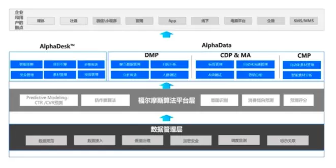 其中,深演智能智能企业数据管理系统AlphaData主要包括数据管理层、模型算法层、业务应用层等多个层级。在业务应用层,公司形成了客户数据管理平台(CDP)、数据管理平台(DMP)、营销自动化(MA)等核心产品。