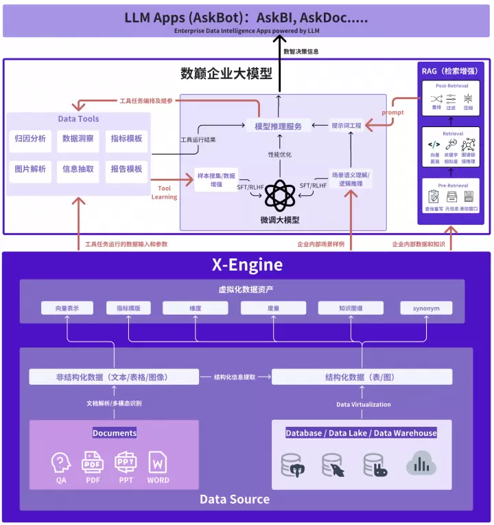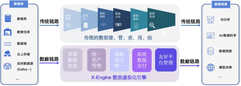 在数巅企业大模型的底座中,数据虚拟化引擎X-Engine发挥着举足轻重的作用。它为数巅企业大模型提供多模态数据的统一接入、计算存储、数据治理、数据加速等一站式能力,堪称数据智能自动化的最佳推进器。