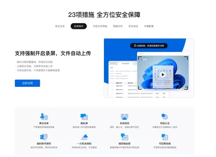 ToDesk企业版通过设有账号权限分类开设、黑白名单管理、限制文件传输方向、限制剪切板传输方向、增设明暗水印、新增内网IP地址展示、单独筛选“正在连接中”的连接记录、控制台一键干预、控制台登录二次校验、安全日志、录屏操作、可控文件传输、专属配置等多样功能及加密技术等,为企业用户的远程操作过程带来全流程的安全守护。