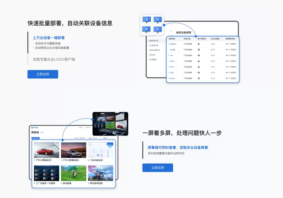 在针对为多台设备进行ToDesk企业版应用的部署,产品有开发并内置快速批量部署功能,可通过输入命令行静默安装,一键部署万台设备,并且支持2种绑定方式。在远程办公场景下,采用账号、密码登录绑定较合用;在如权限管控更强、对信息安全要求更高、无人值守等场景下,采用企业部署码的方式则更合用。