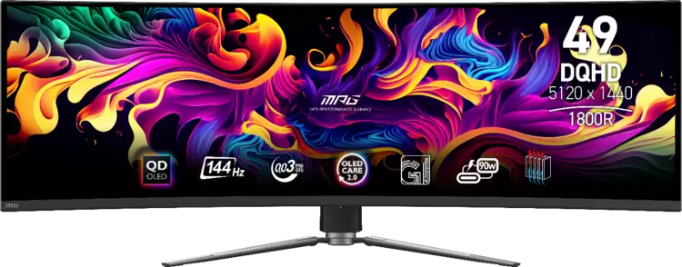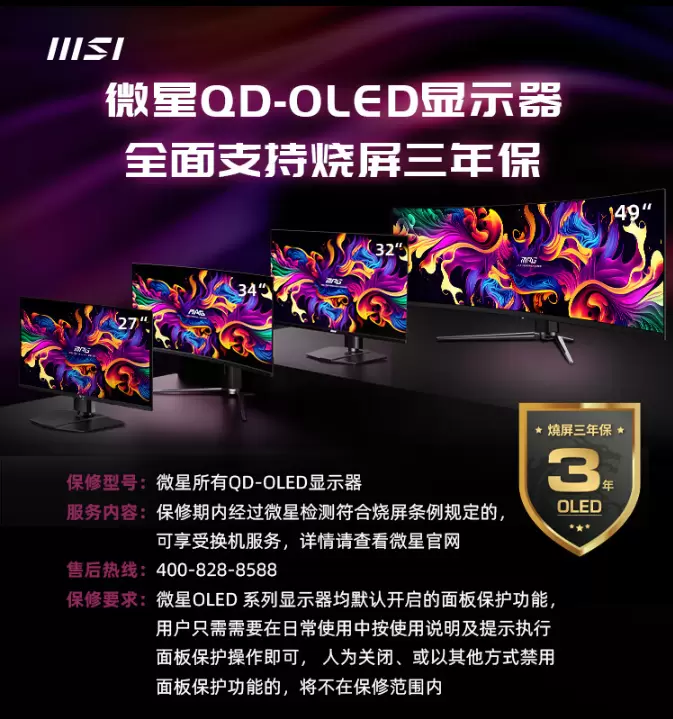 此外,微星还推出了例如屏幕更大的MPG 491CQP QD-OLED曲面显示器,这款显示器采用了49英寸的超宽带鱼屏设计,屏幕比例为32:9,支持高达144Hz的刷新率和0.03ms的GTG响应时间,这对于需要快速且精确动作的第一人称射击游戏、格斗游戏、赛车模拟游戏、即时战略游戏和体育游戏等来说,是非常有利的。更有微星免费的三年上门服务加持,10分钟响应,4小时上门,更有烧屏三年保,让产品售后无忧。