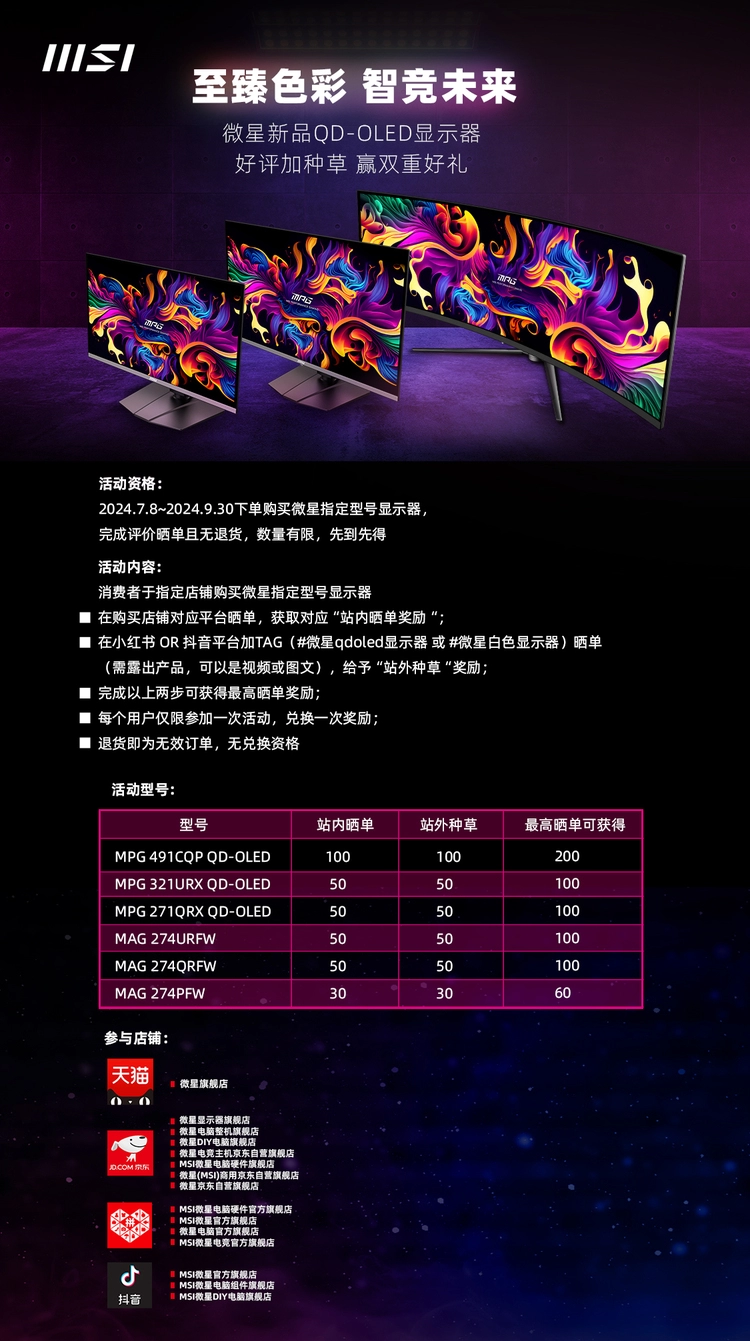现在,微星更是为广大用户准备了一场限时专属的晒单福利活动。从2024年7月8日至9月30日,凡购买微星指定型号的显示器,包括QD-OLED系列以及适合办公使用的MAG 274QRFW等系列,均有机会享受到这一特殊福利。想要了解更多活动细节和规则,请查阅下表,不要错过这一难得的优惠时机!