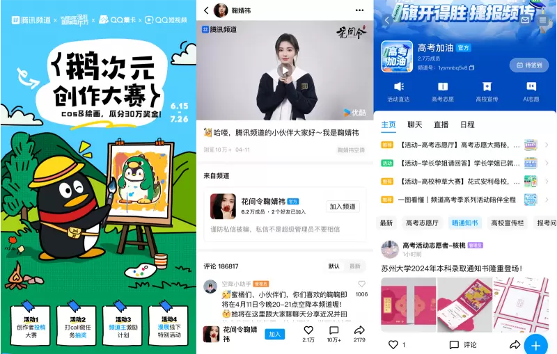 腾讯频道具备成熟的生态运营,可为创作者提供活动大舞台,让用户在参与中找到同好社交的获得感和归属感。目前二次元、校园、影视综等特色品类频道已经开展诸多火热的精品活动,吸引了大批用户的踊跃讨论和参与,例如: