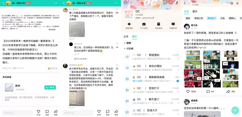 高考期间,在语文、数学、物理等学科频道中,不少隐藏学霸上线探讨作文思路、压轴题解法,其中关于数学最后一题的讨论甚至激活了前奥赛金牌得主、清华学霸、金融打工人等上百名学霸的刷屏解题赛;而OC频道的花式“养娃”大法最近也是格外引人注目,现实中的社畜竟在频道里频频“晒(二次元)娃”?把现实中不能实现的幻想,交给平行世界的“OC”完成,似乎正成为越来越多人的“回血大招”,而频道里的友爱氛围让即使刚入门小白的OC都能生活在一个充满关爱、友好互助的氛围中。